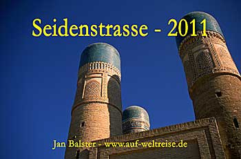 Der neue Kalender „Seidenstraße 2011“ des Dresdener Globetrotters Jan Balster ist soeben erschienen. Der Kalender: Samarkand und Buchara – Namen aus Tausendundeiner Nacht, grandiose Architektur einer jahrhundertealten Geschichte. Ein Streifzug durch die nördlichen Länder Zentralasiens zwischen Usbekistan nach China. Der Betrachter erliegt einer Faszination hervorragender Fotografien, die optimal in Szene gesetzt sind.