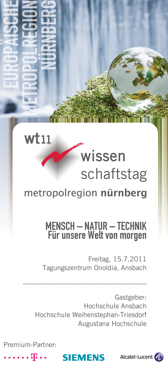 Pressetext verfasst von Kulturidee am Mi, 2011-06-22 12:01.Unter dem Titel „Mensch-Natur-Technik: Für unsere Welt von morgen“ lädt der mittlerweile fünfte Wissenschaftstag der Europäischen Metropolregion nach Ansbach ins Tagungszentrum Onoldia ein. Vertreter aus Wissenschaft, Wirtschaft, Politik, Bildung und Medien treffen sich dort, um zusammen einen Blick in die nahe Zukunft verschiedener Lebensbereiche zu werfen und die Herausforderungen einer modernen Gesellschaft zu erörtern.