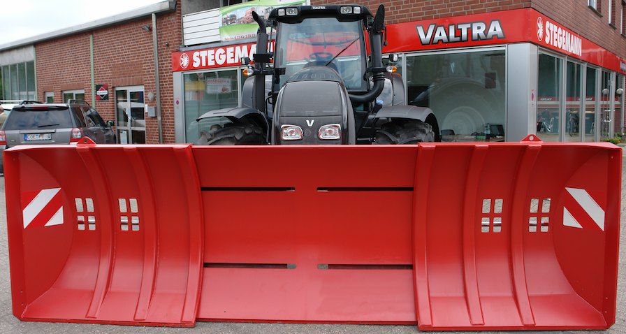 Die Konstruktion des Schildes ist eine Gemeinschaftsarbeit der beiden Firmen STEGEMANN und eines Lohnunternehmer. Die Idee zum variablen Schild kommt aus der Praxis, die stabile Bauweise aus den Erfahrungen der STEGEMANNN Maschinenbau und die Wünsche der Kunden aus den Vertriebserfahrungen der STEGEMANN Landtechnik. Das Ergebnis dieser Zusammenarbeit ist ein ausgesprochen professionelles Werkzeug für die Betreiber von Biogasanlagen und Lohnunternehmer. Während des Arbeitsvorganges wird die Breitenverstellung stufenlos über die Hydraulikzylinder von 2,70 Meter bis auf 4,30 Meter verstellt. So kann es variabel in kleinen wie auch großen Silos eingesetzt werden. Der besondere Clou sind jedoch die hervorstehenden Rippen. Sie sorgen nicht nur für die Stabilität, sondern auch um die Schiebekanten immer in einer Linie zu halten. Der Fahrer verteilt mit Ihnen das Schüttgut von einem Haufen mit der hydraulischen Breitenverstellung von innen nach außen auf die breite Fläche des Silos. Der Schlepper muss nicht einen großen Haufen überfahren, sondern festigt die Silage schichtweise.