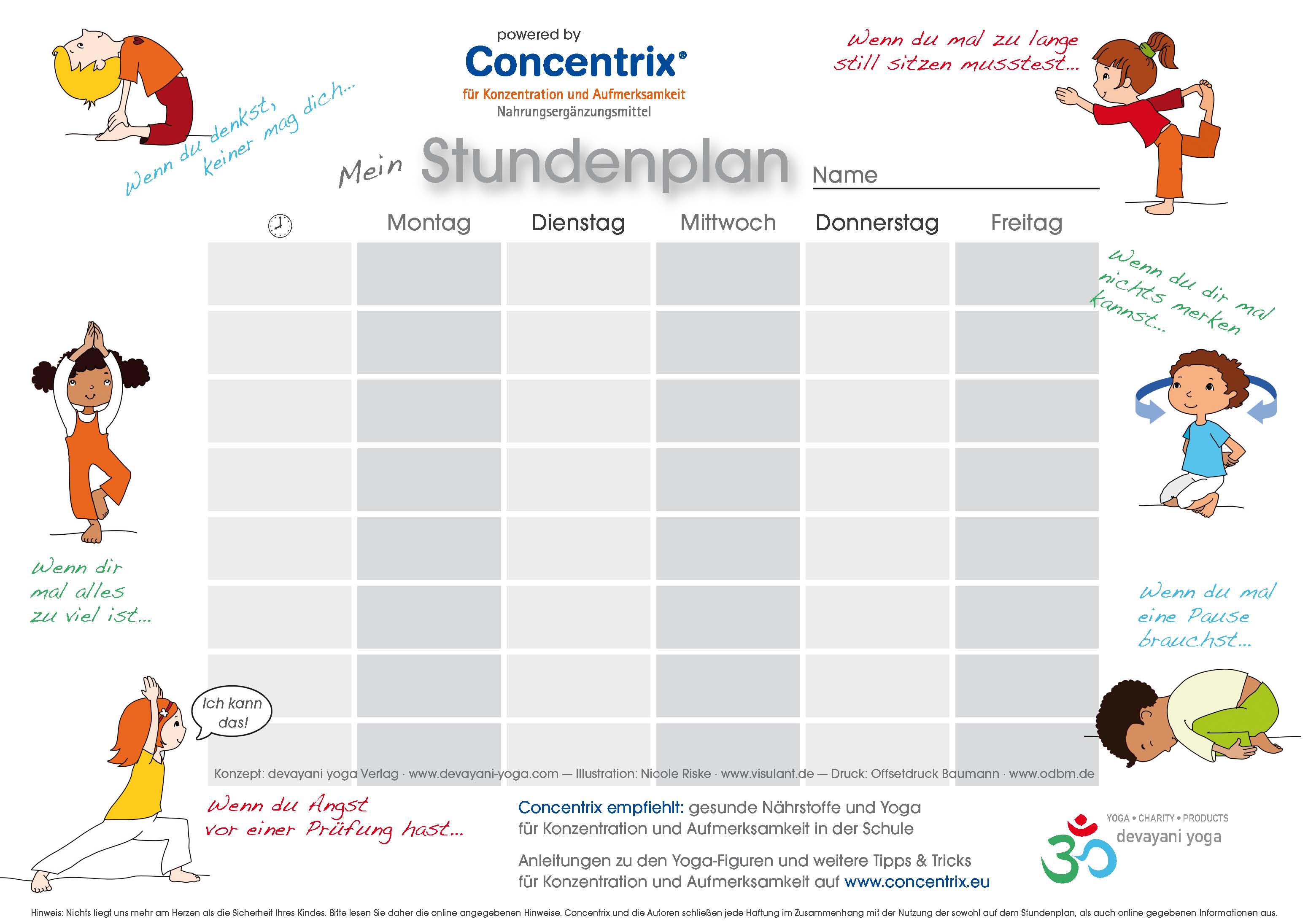 Concentrix unterstützt Schulkinder zusätzlich mit pädagogisch wertvollen Giveaways. So hat Concentrix in Kooperation mit devayani yoga einen Stundenplan mit Yogaübungen und wertvollen Tipps und Tricks für besseres Lernen und mehr Spaß in der Schule entwickelt. Der Stundenplan steht zum Gratis-Download auf www.concentrix.eu zur Verfügung. Ebenso befinden sich auf der Homepage Informationen zu den auf dem Stundenplan aufgezeigten Yogaübungen und wertvolle Tipps und Tricks für Konzentration und Aufmerksamkeit.