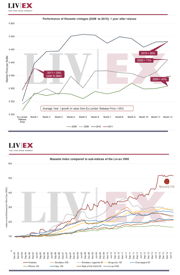 Der Masseto hat, seit er auf den Markt kam, innerhalb von nur 12 Monaten eine Wertsteigerung von 90 % erfahren (Quelle: Liv-Ex: beim Jahrgang 2008 waren es im Folgejahr +48 %, beim Jahrgang 2009 +71 %. Der Jahrgang 2010 kam auf + 90 %, und der in diesen Tagen herausgekommene Jahrgang 2011 kann bereits ein Plus von 29 % gegenüber den Anfangswert verbuchen). Überdies: Wenn wir die Wertzuwächse des Masseto seit 10 Jahren bis heute betrachten, stellen wir fest, dass er seinen Wert verfünffacht hat (Quelle: Liv-Ex, siehe Grafiken).