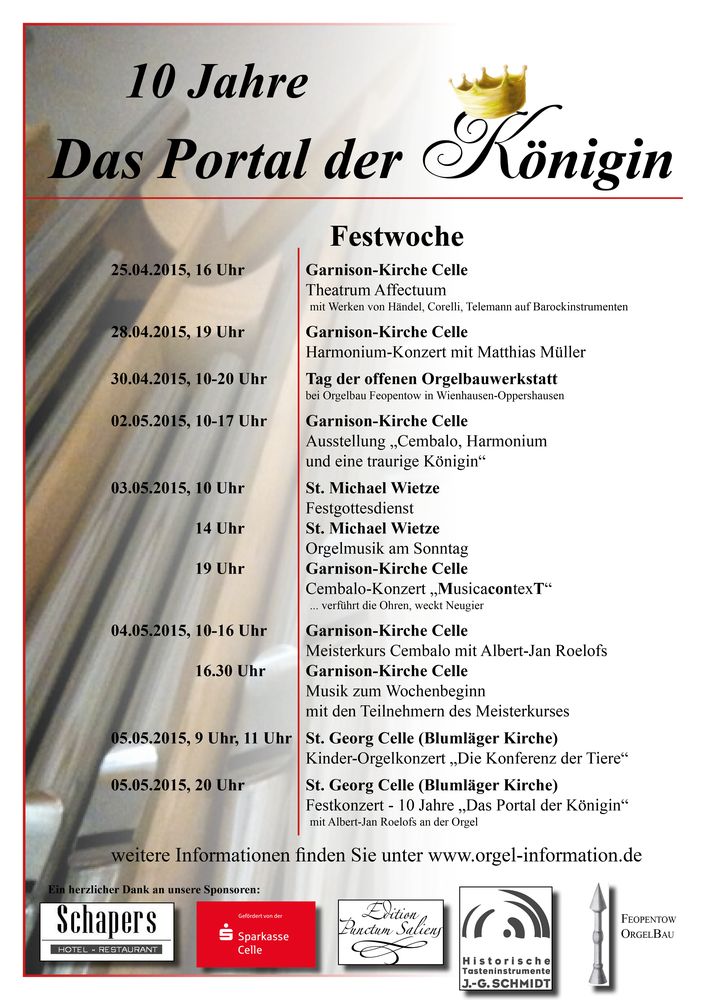 10 Jahre Kontinuität, 10 Jahre Kontakt zu Kirchengemeinden und Kirchenmusikern, 10 Jahre mit zigtausenden E-Mails, Briefen, Faxen und unbeschreiblich vielen Arbeitsstunden. Das muss gefeiert werden! Und so findet vom 25.04.2015 bis zum 05.05.2015 eine Festwoche in Celle und Wietze statt. Angefüllt mit Konzerten und Veranstaltungen, einem Meisterkurs, Festgottesdienst und Festkonzert bieten sich viele Möglichkeiten für Musikgenuss, Weiterbildung oder musikalisch angereicherte Gespräche.