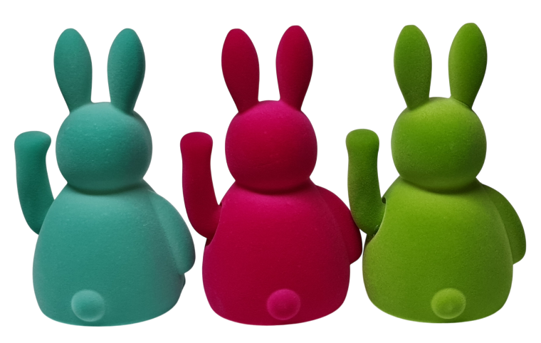 Inspiriert vom Stil der bekannten chinesischen Winkefiguren hebt der Hase spielerisch seine Pfote und begrüßt Betrachter auf sympathische und humorvolle Art. Diese kleine, kontinuierliche Bewegung verleiht der Figur eine lebendige Präsenz, die sie deutlich von klassischer, statischer Osterdekoration abhebt. Der winkende Osterhase wirkt modern, überraschend und gleichzeitig vertraut – ein dekoratives Statement, das Tradition und zeitgemäßes Design miteinander verbindet.